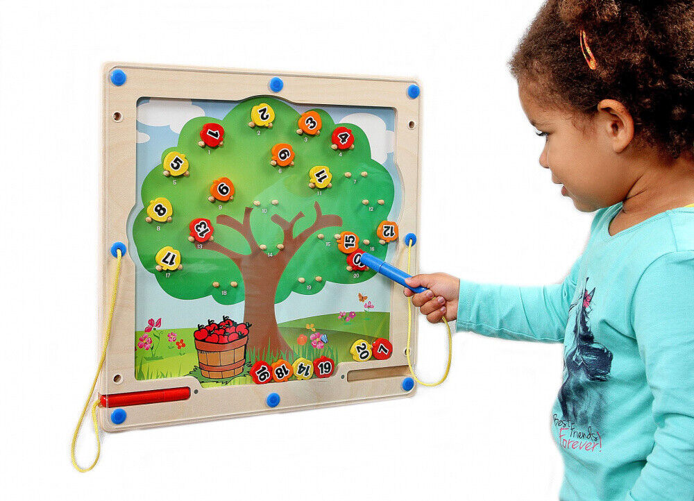 Diese Äpfel kann man zu jeder jahreszeit pflücken! Mit Hilfe von zwei magnetischen Stiften können die nummerierten Äpfel bewegt werden. Die Äpfel sollen dabei den zahlen auf dem Baum zugeordnet werden. Das Spiel besteht überwiegend aus Holz. Umgeben ist das Wandelement von einer durchsichtigen Umrandung aus Kunststoff. Mit einer Größe von 40 x 40 x 3 cm findet das Motorikspiel an vielen Zimmerwänden einen Platz, es kann aber auch auf einem Tisch aufgestellt werden.. Das Set umfasst außerdem zwei Standfüße und 20 magnetische Zahlenchips in Apfelform. Die Magnetstifte sind auf der linken und rechten Seiten durch eine Schnur am Rahmen des Motorikspiels fixiert. Das zentrale Element des Zuordnungsspiels stellt der farbenfroh gestaltete Apfelbaum dar.