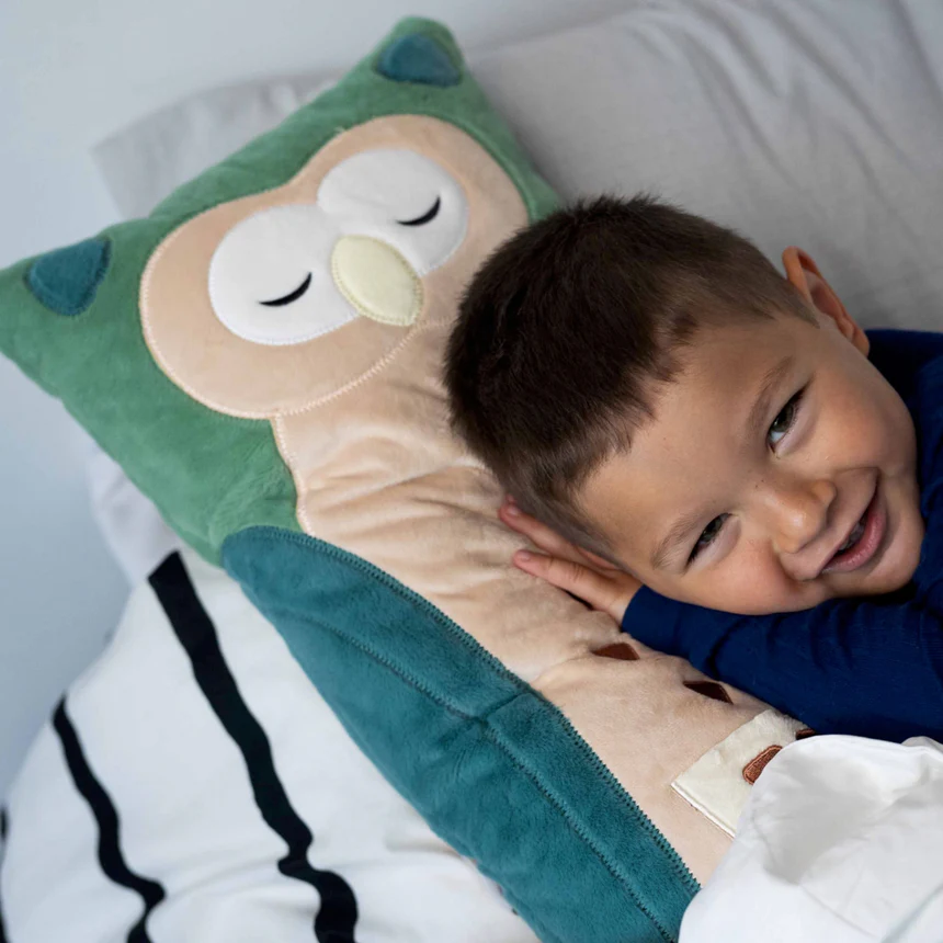 Das plüschige Eulenkissen mit zusätzlichem Fidget in Federform spendet Trost und hilft unruhigen Kindern sich auf eine erholsame Nachtruhe einzustimmen