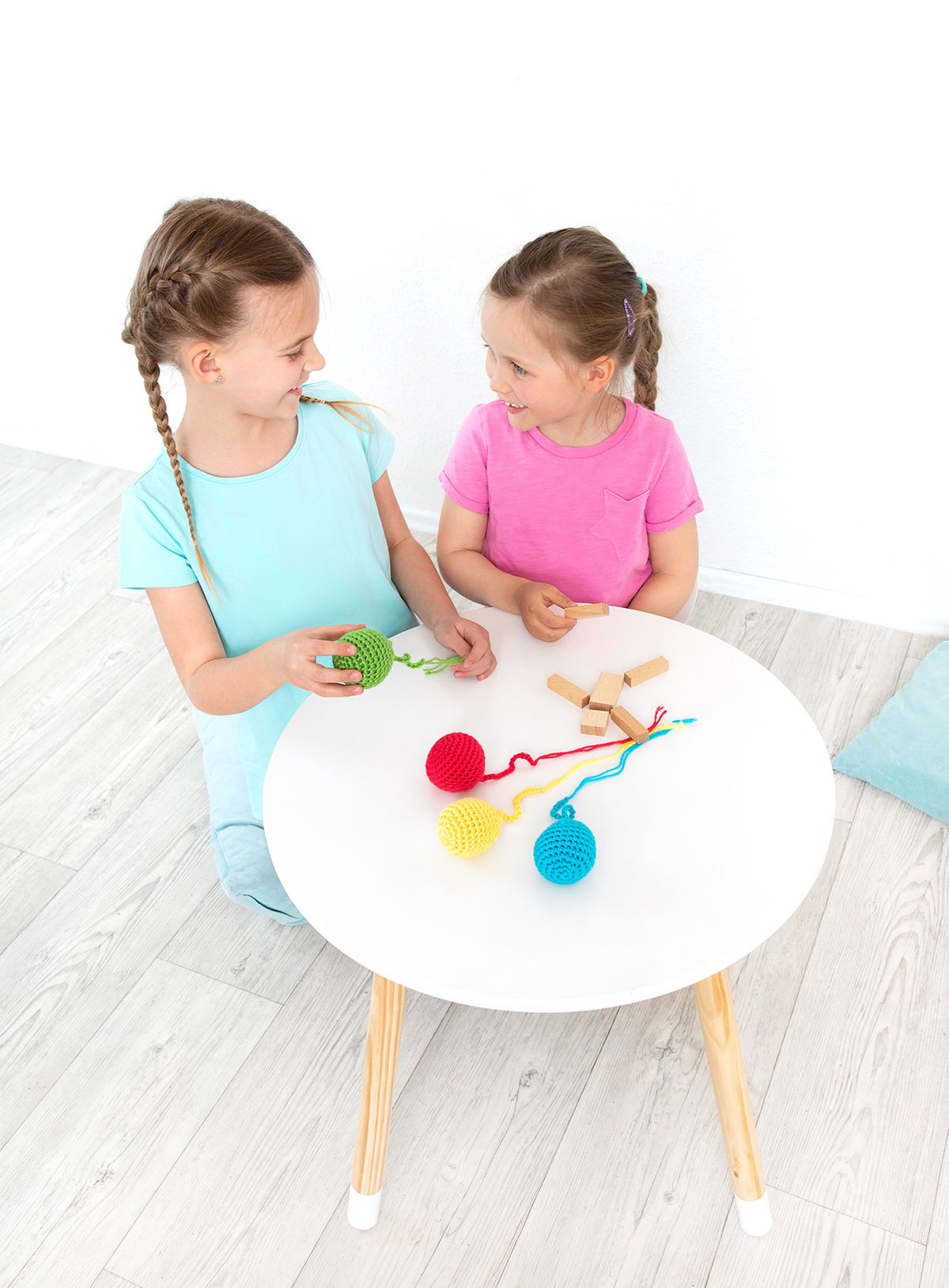 Das erste Spielzeug eines Kindes ist nach Fröbel der Ball. Mit der „Spielgabe“ 1, den sechs Wollbällen, wird das kindliche Interesse durch Bewegung geweckt. Mit dem Ball kann das Kind in die Welt der Bewegung hineinfinden. Durch den Nachahmungstrieb inspiriert, kann es die eigene Geschicklichkeit entwickeln. Die 2. „Spielgabe“ - die berühmteste von Fröbel - enthält eine Kugel, eine Walze und einen Würfel. Es geht darum die schiefe Ebene und die Eigenschaften dieser drei Figuren spielerisch kennenzulernen. Die Bausteine laden die Kinder zum Experimentieren ein.