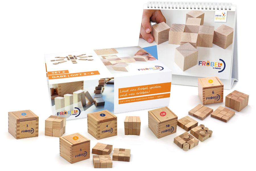 Die Baukästen enthalten von einfachen Körpern wie den Würfeln bis hin zu Viertelwürfeln und Dreiecksprismen verschiedene Formen, die aufeinander in ihrer Schwierigkeit aufbauen. Insgesamt gibt es fünf verschiedene Baukästen. Diese sind generell so angelegt, dass sie das Kind durch ihre elementaren Formen zum Spielen, Experimentieren und Konstruieren anregen. Mit den Spielgaben 3 bis 6 lassen sich neben Lebensformen, auch Schönheits- und Erkenntnisformen konstruieren. Um die pädagogischen Aspekte aus Fröbels Zeiten in das 21. Jahrhundert zu transportieren, können die Kinder Materialien aus der heutigen Zeit verwenden, um die Spielgaben kreativ zu ergänzen.