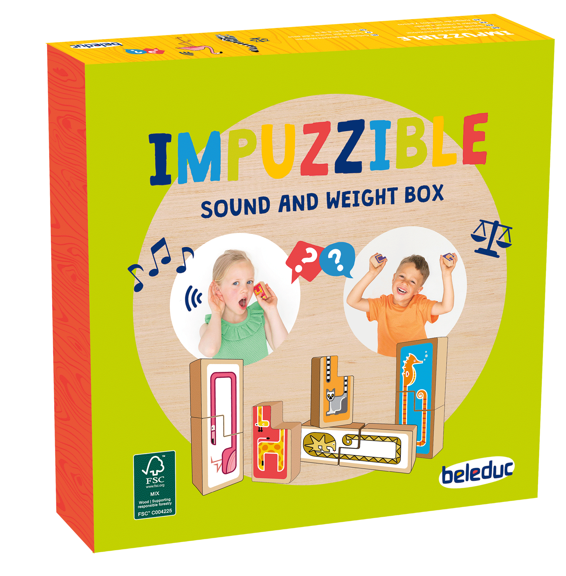 Mit diesem Memo-Spiel werden Gehör und das Gefühl für Gewichte trainiert. Ziel ist es die passenden Paare anhand des Gewichts oder des Geräusches zu finden und das Pärchen zusammenzupuzzeln. So entstehen lustige Tiere! Mit Impuzzible wird im Spiel das Gehör und die Konzentration ganz besonders gefördert. Die Box überzeugt durch ein innovatives Konzept und eine sehr moderne und ansprechende Tier-Illustration. Bei den Gewichten ist natürlich der Elefant am schwersten und das kleine Katta am leichtesten.