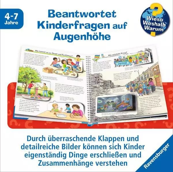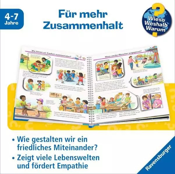 Wozu gibt es Regeln? Was ist Mitbestimmung? Wie entsteht Streit oder gar Krieg? Detailreiche Illustrationen zeigen, was unser Zusammenleben ausmacht. Klappen lösen Situationen auf und regen zu Empathie an: Fällt jemand hin, hilft man ihm auf. Wird jemand verspottet, steht man der Person bei. Ist die Treppe der einzige Weg, braucht es eine Rampe für Menschen im Rollstuhl. Das Buch zeigt mit kindgerechten Bildern und Texten Probleme auf, bietet Lösungen an und wirbt für gegenseitiges Verständnis.
