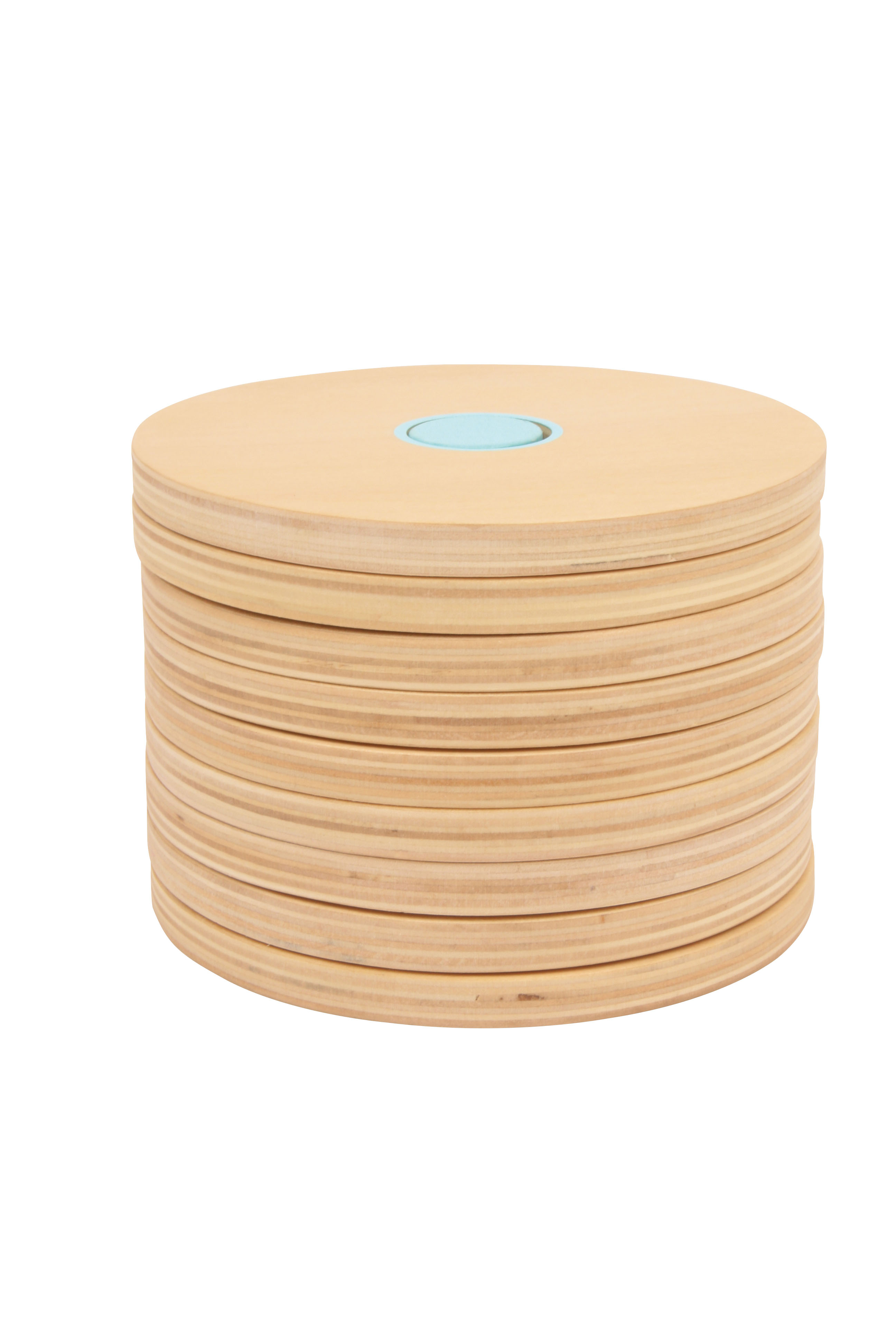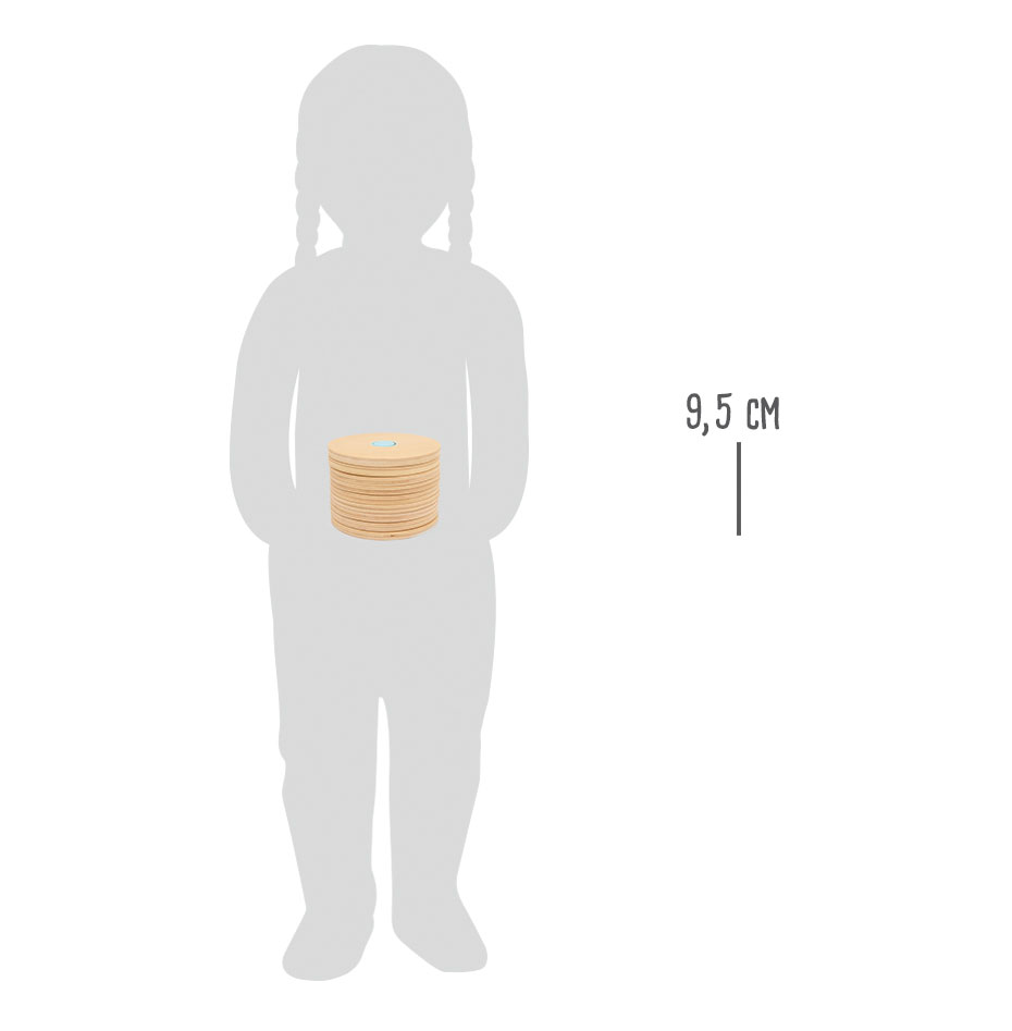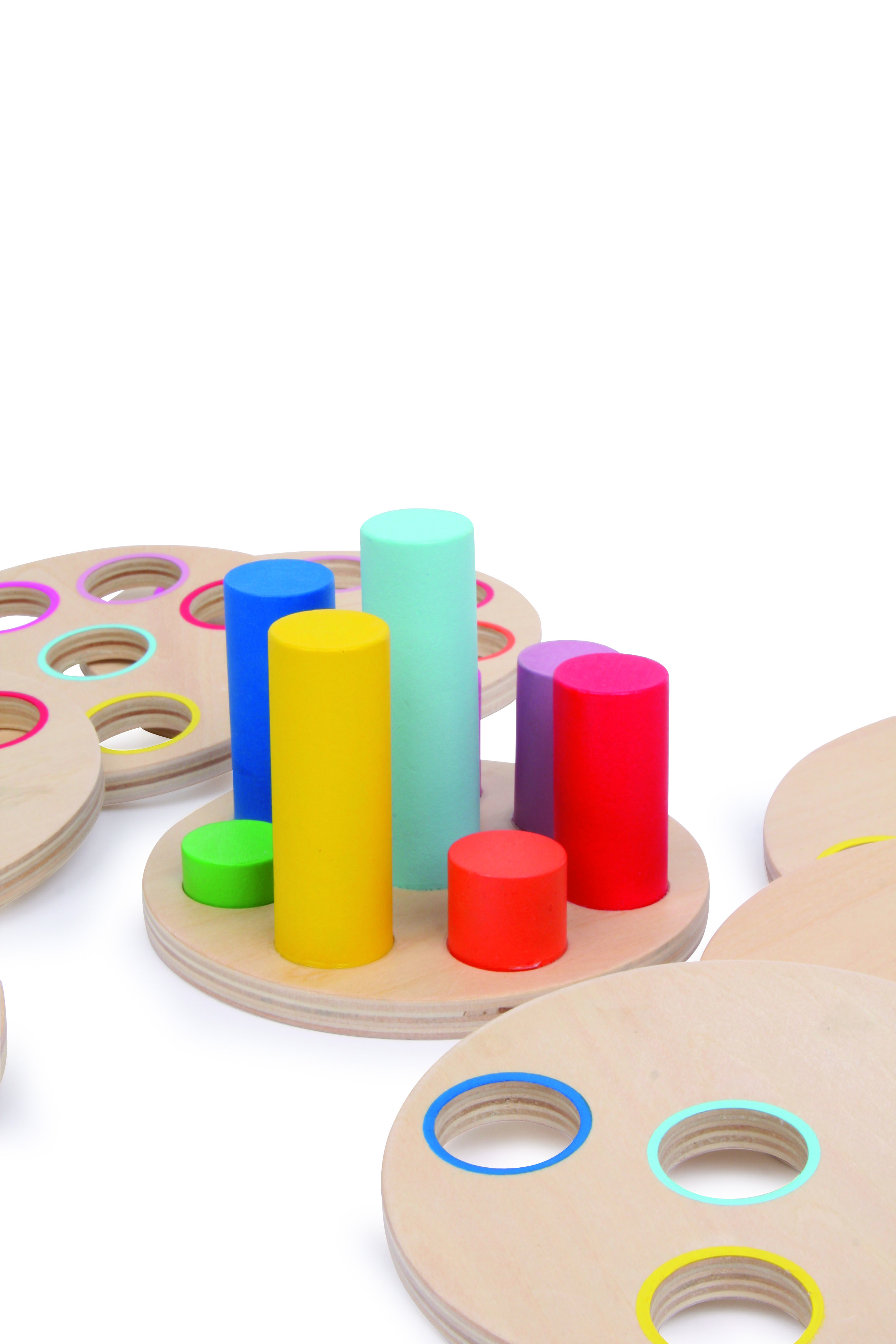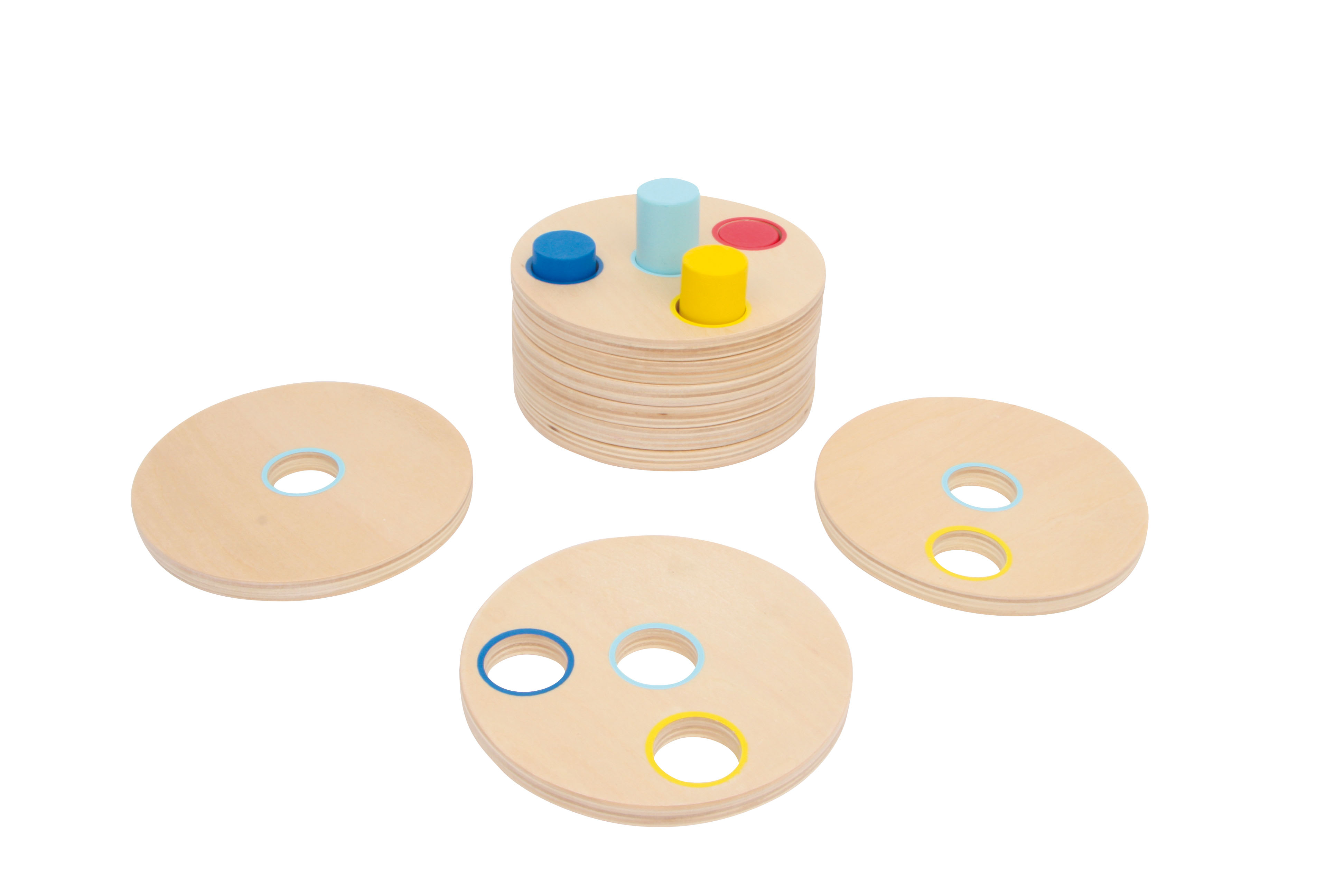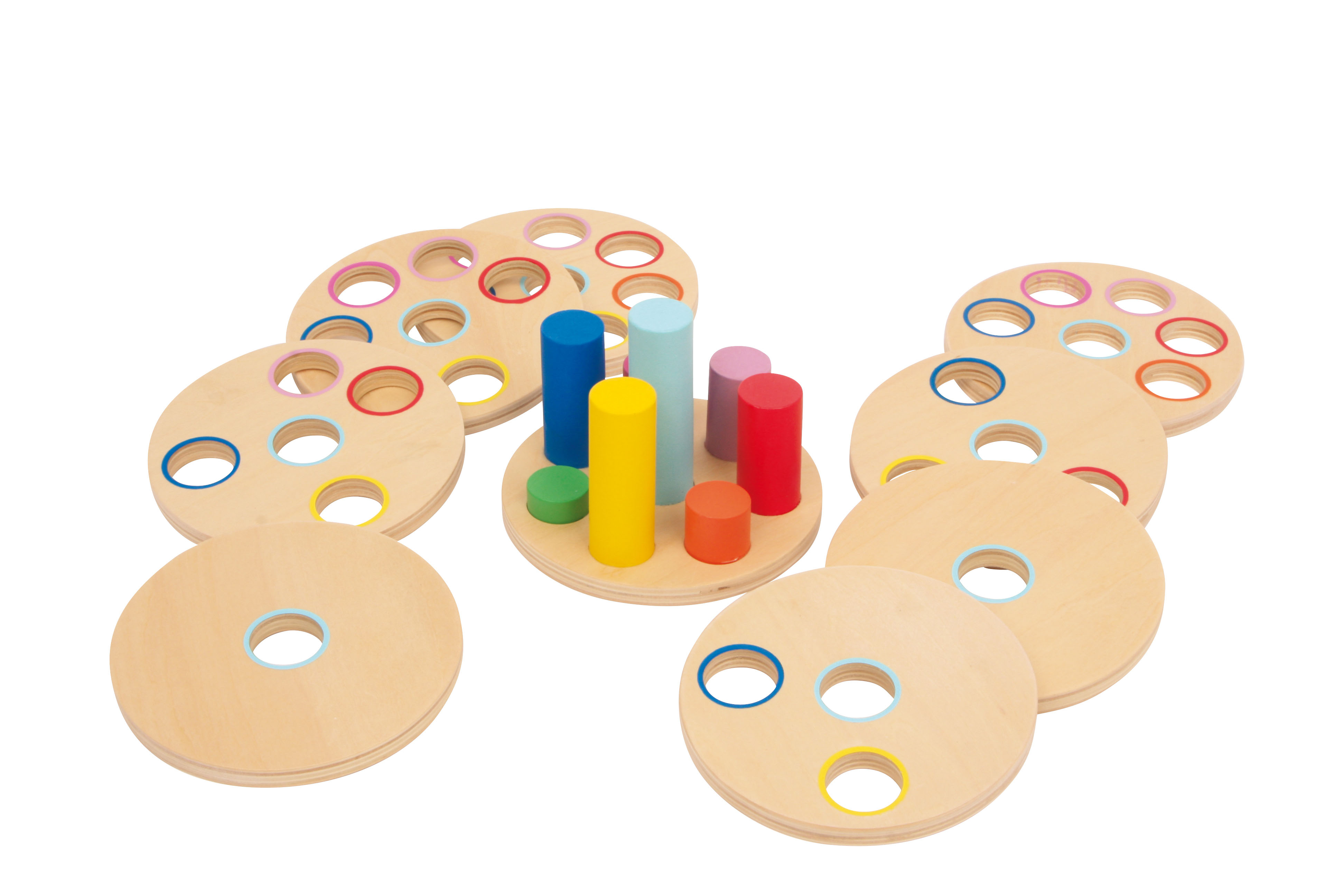 Acht stabile Scheiben (1 cm stark) aus fein geschliffenem Schichtholz sollen auf die farbigen Stäbe gesteckt werden. Da die Stäbe unterschiedlich lang sind und jede Scheibe immer eine Öffnung weniger hat als die vorhergehende, gibt es zur Lösung nur einen Weg!