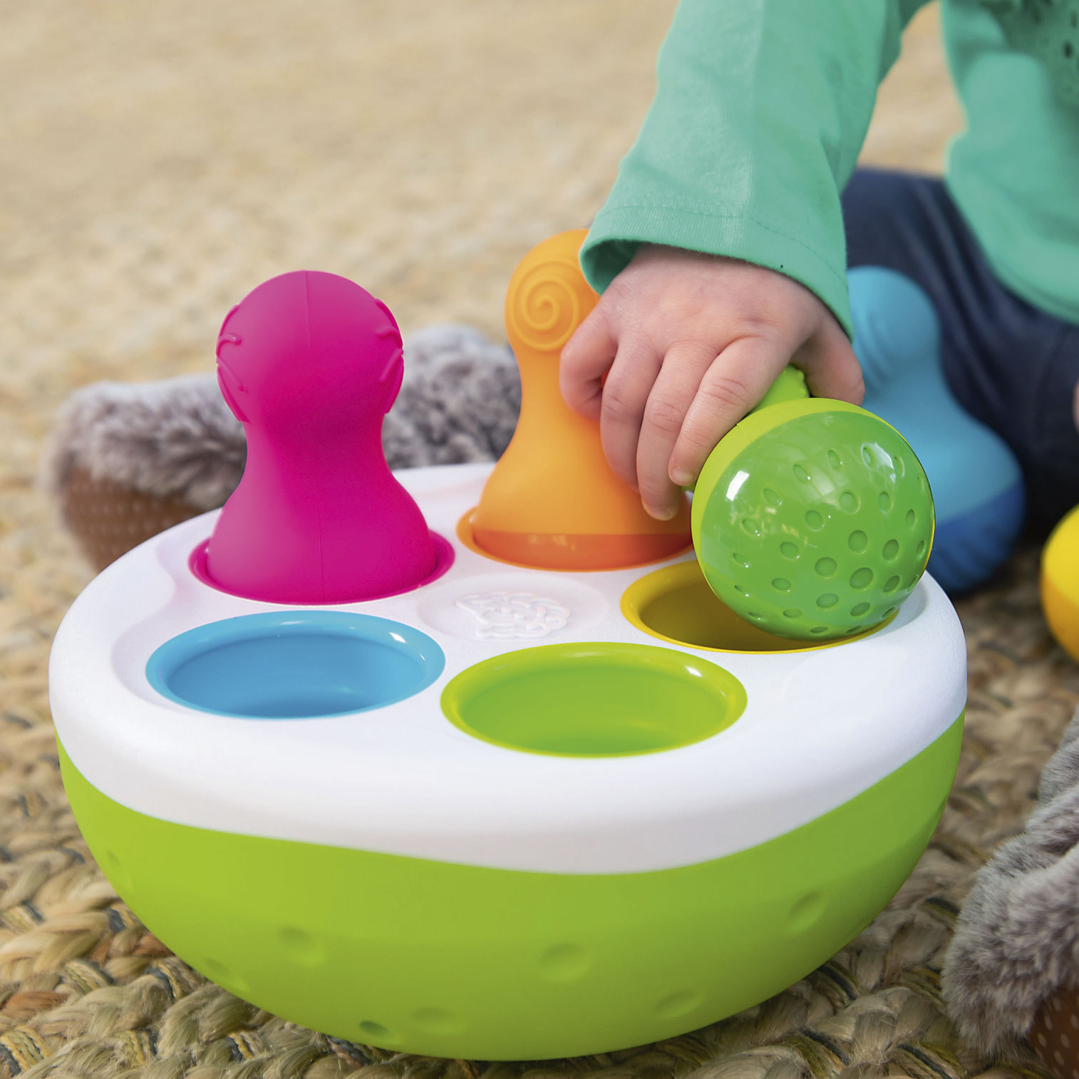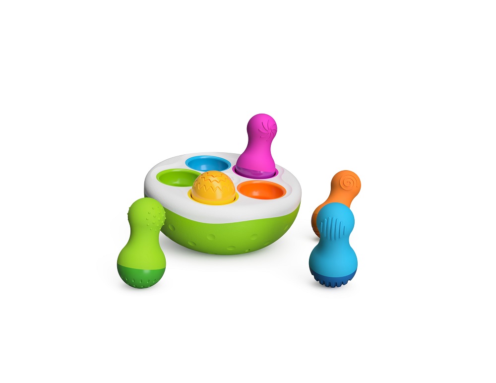 In dem großen grünen Wackel-Boot, das bei jeder Bewegung Klänge von sich gibt, sitzen 5 bunte Figuren. Jede dieser kegelförmigen Figuren ist wie ein Stehauf-Männchen gewichtet und lässt sich so schnell nicht aus dem Gleichgewicht bringen. Es wackelt lustig hin und her, bleibt am Ende aber aufrecht stehen, wie stark der Seegang auch sein mag. Wer diese Kegel erkundet, wird bald die unterschiedlichen Texturen erfühlen. Wird es den Seeleuten zu bunt, können sie auch - kopfunter - im Boot verschwinden. Das Boot wackelt und das eingebaute Glockenspiel klingelt, je nachdem wie das Gewicht verteilt ist. Ein wunderbar vielseitiges Spielzeug, um erste Experimente mit Balance und Bewegung anzustellen, zum Stecken, Farbsortieren und zum Erfühlen der unterschiedlichen Strukturen. Ab 6 Monate einsetzbar. Kegelhöhe 4,5 cm.