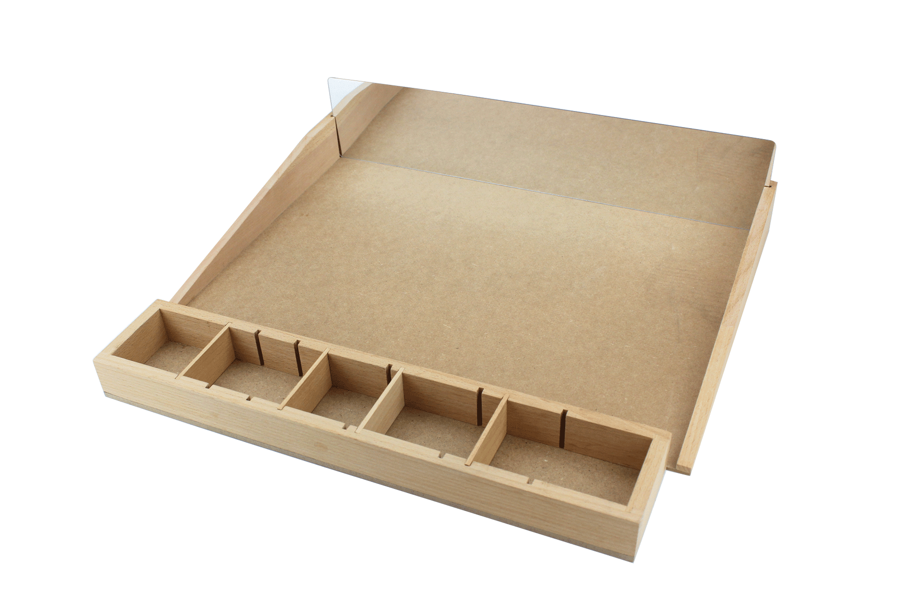 Die zwei riesigen Lerntabletts ermöglichen Kindern Selbstständigkeit beim Spielen, Lernen und Erfahren. So kann auf den Lerntabletts Spiel- oder Lernmaterial präsentiert werden, bei dem das Kind selbst entscheiden kann, wie es damit umgeht. Ideal auch in Kombination mit den Spielgaben nach Friedrich Fröbel. Die Lerntabletts fördern das konzentrierte Arbeiten von Kindern. In einem klaren Rahmen können sie Dinge (z.B. die Fröbel Legematerialien) nach Farben und Formen sortieren, legen, miteinander vergleichen und vieles mehr. Das Besondere: die Tabletts sind zum Kind offen, es gibt keine störenden Barrieren. Der hintere Rand ermöglicht Sortierübungen nach Auswahlkriterien, die das Kind bestimmt. Der Rand ermöglicht aber auch einen sicheren Transport zum Tisch und zurück zum Regal, ohne das etwas herunterfällt. Die Sortierleiste ist optional herausnehmbar. Mit zusätzlichem Spiegel für tolle Experimente.